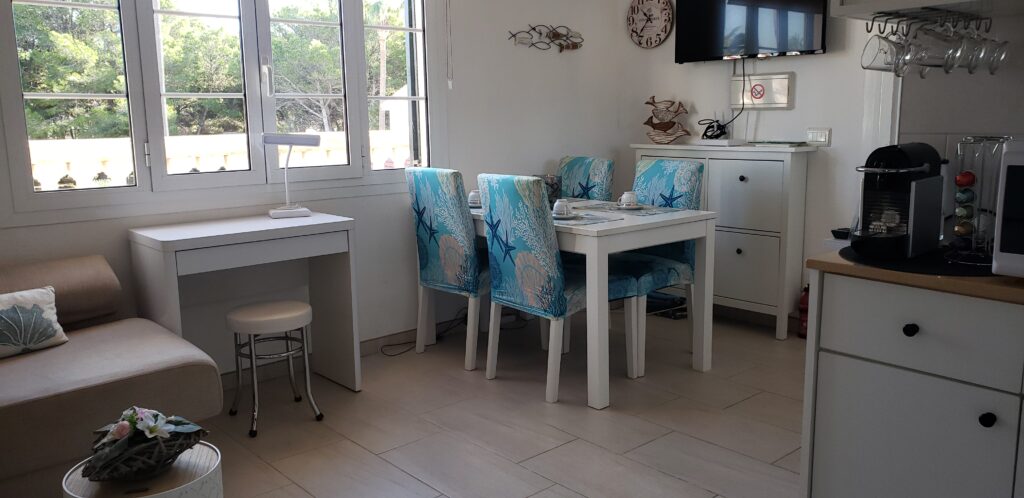 • Entrée-salon avec canapé (confortable et méridienne), TV 39 pouces, table de salle à manger et 4 chaises, 1 bureau avec siège.