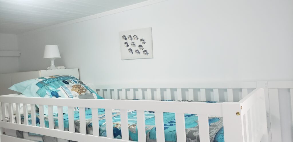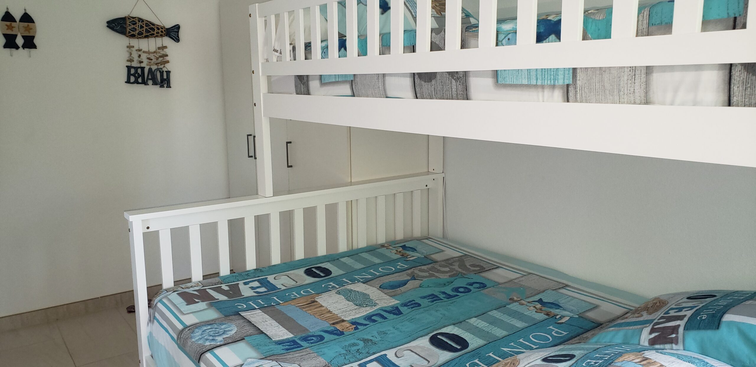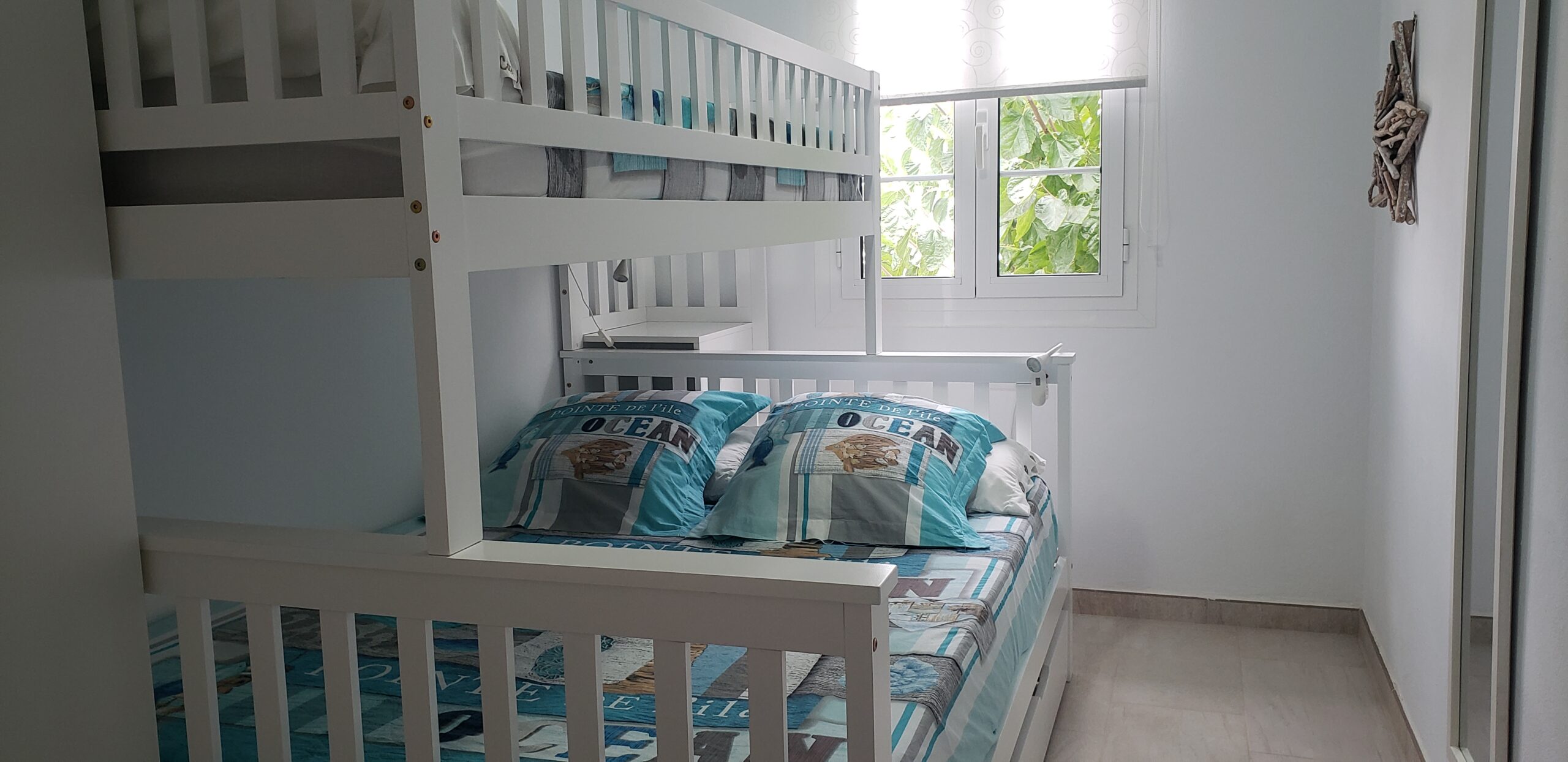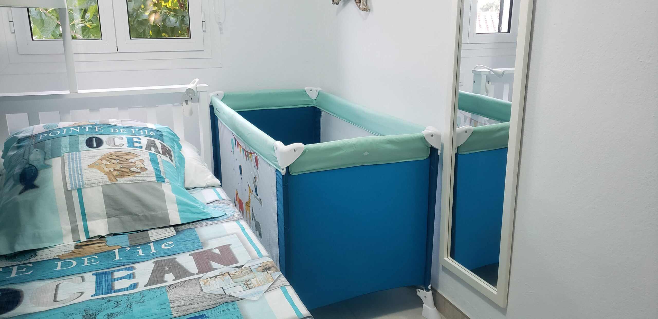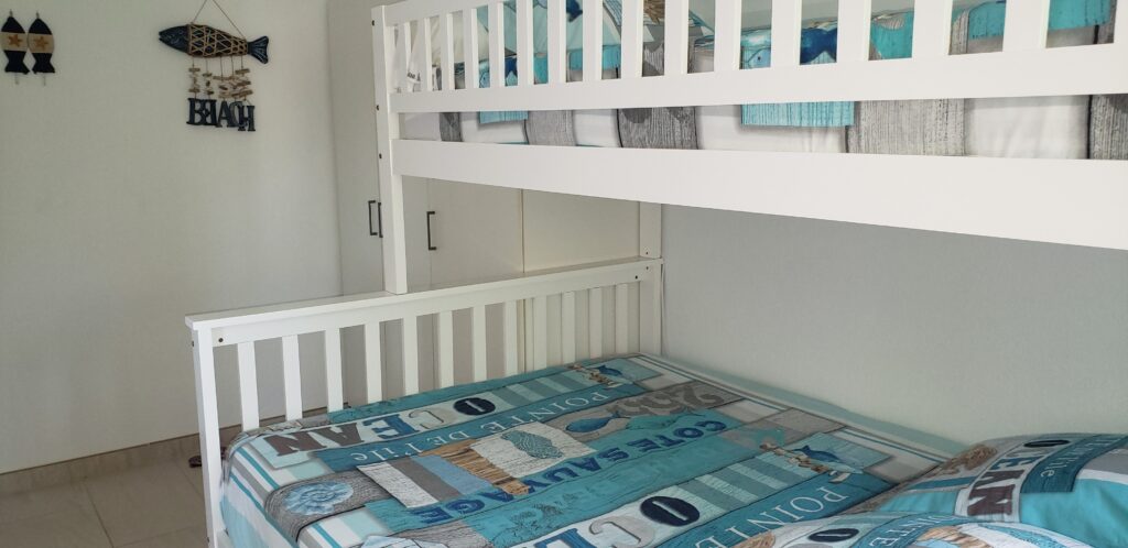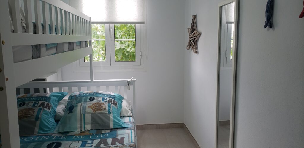 • Une chambre 2 avec 1 lit en 140 x 200 cm + 1 lit simple de 90 cm homologué pour des enfants de plus de 6 ans + éventuellement la place pour un lit parapluie (sur demande), armoire, rangements et ventilateur mural avec télécommande.